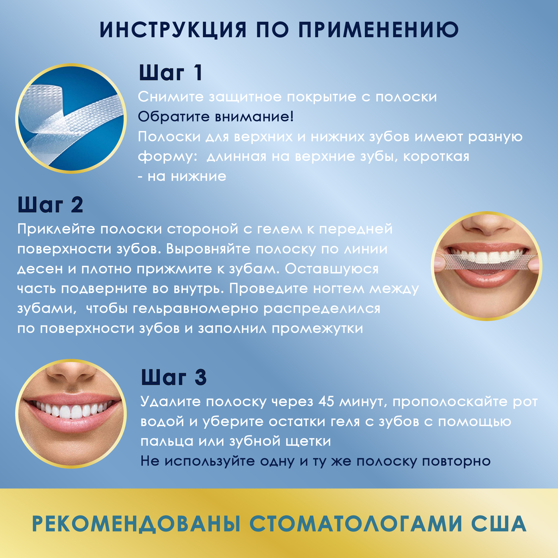 В упаковке 10 отбеливающих полосок, 5 для верхних и 5 для нижних зубов.