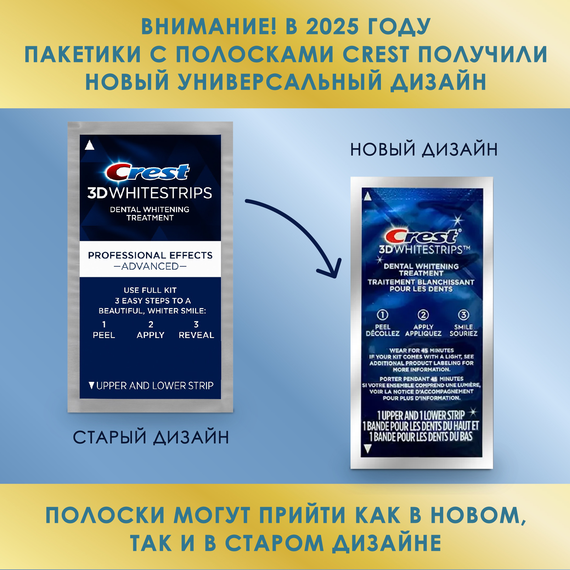 Полоски Crest 3D White Whitestrips Professional Effects являются самыми популярными среди курсов отбеливания от компании Crest и являются самым оптимальным курсом не вызывающим чрезмерную чувствительность и при этом обеспечивающие максимальный результат. Вы получите отбеливание профессионального уровня по доступной цене. Для полосок специально разработана безопасная для зубной эмали формула обеспечивающая глубокое удаление зубного налета и поверхностных пятен, а так же охват большей поверхности зубов при отбеливании. Используемые в полосках ингредиенты и компоненты применяют в стоматологических клиниках при профессиональном отбеливании зубов. Совершенно безопасно для эмали зубов. Рекордный отбеливающий эффект до 18 месяцев и более!