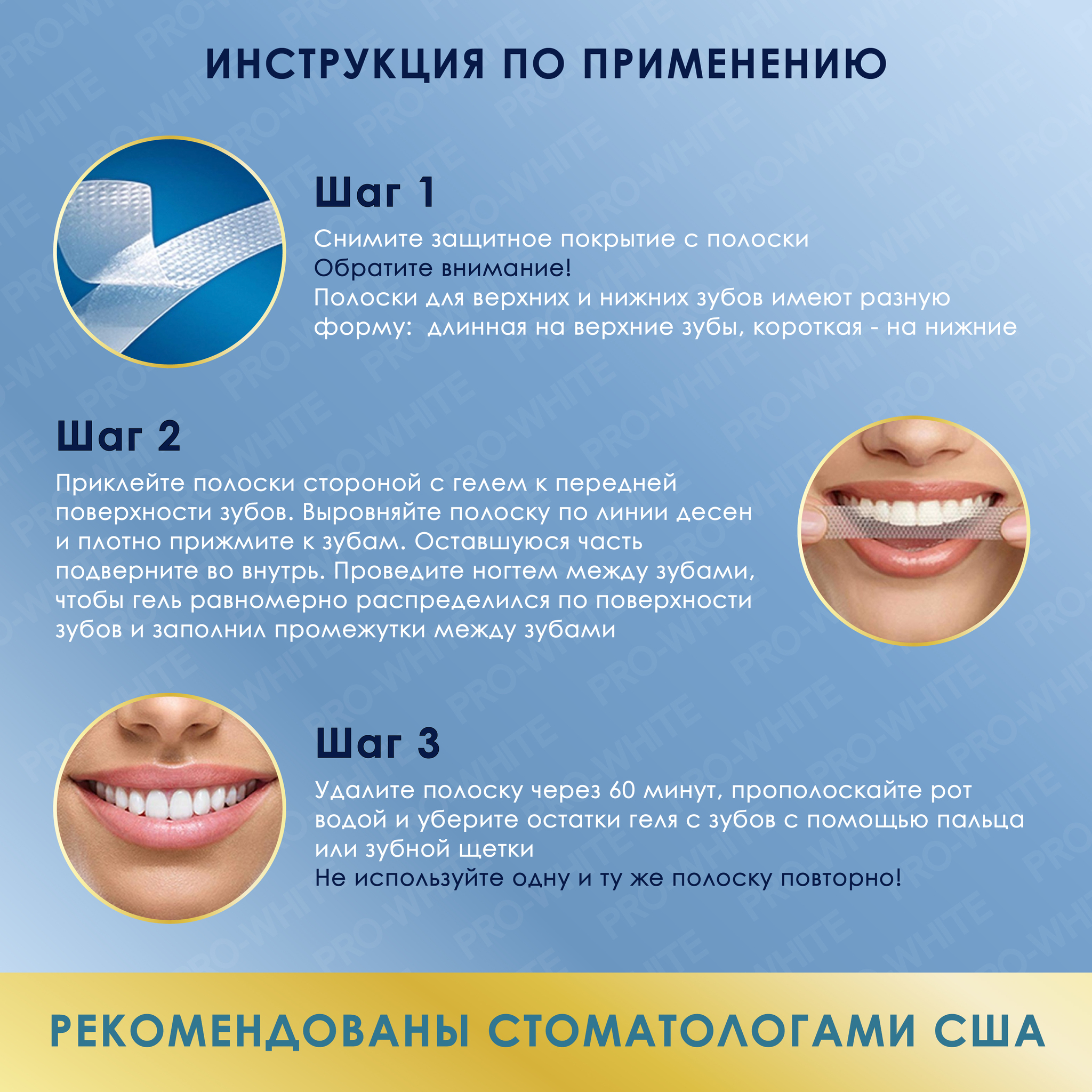 3) Держите полоски на зубах 60 минут, а затем снимите их и прополощите рот обычной водой. Процедура окончена. Не чистите зубы ПЕРЕД использованием полосок, т.к. паста создает защитный слой на эмали, что существенно ухудшает результат. Просто прополоскайте рот водой.